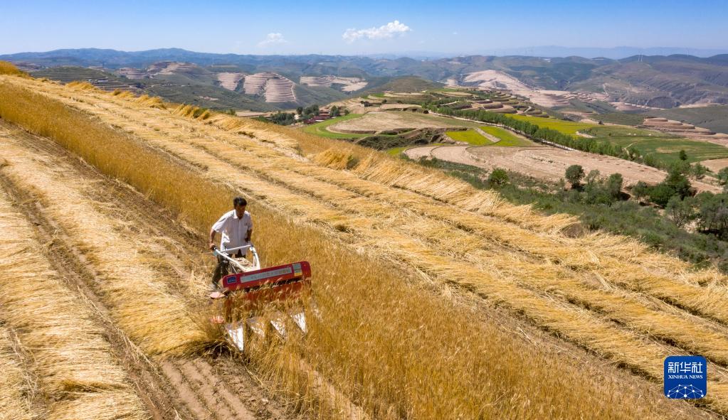 7月3日,寧夏固原市原州區(qū)炭山鄉(xiāng)炭山村村民操作小型割曬機收割冬小麥(無人機照片)。新華社記者 馮開華 攝