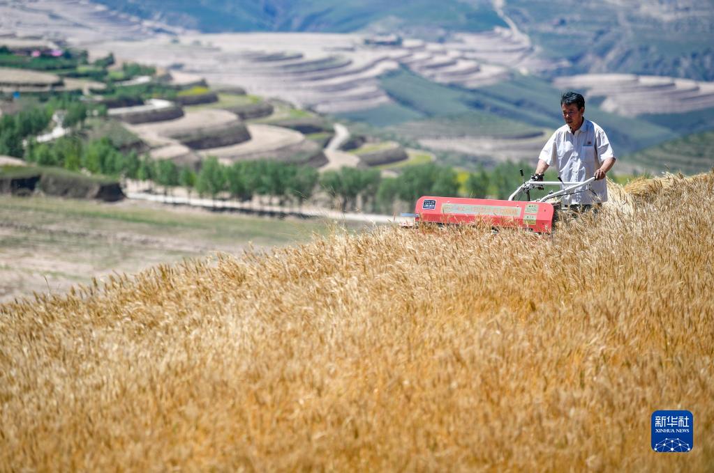 7月3日,寧夏固原市原州區(qū)炭山鄉(xiāng)炭山村村民操作小型割曬機收割冬小麥。新華社記者 馮開華 攝