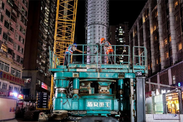 在鋼管立柱施工時,遇見一條10千伏電力管線,空隙僅僅只有10厘米;還有一道污水管距離50厘米。為保護好管線,施工時管理人員現(xiàn)場全程指揮協(xié)調,防止異常情況出現(xiàn)以便能及時協(xié)調解決,使鉆孔設備在小心翼翼地轉動中安全順利完成了鋼管立柱插入施工。2022年10月10日,隨著最后一根26米長的鋼管立柱緩緩吊裝、精準插入鉆孔中,中大八院站蓋挖鋼管立柱全部完成施工。至此,項目部高風險大型起重吊裝施工全部完成、高噪音設備全部退場,中大八院站全面進入深基坑開挖及主體施工階段。項目部經(jīng)受住了第二波考驗。