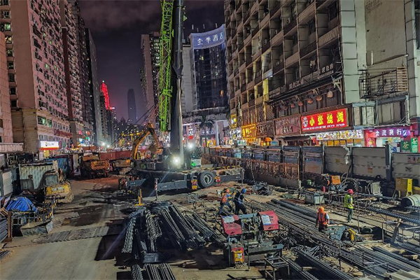 在1號工點的第3層基坑里,東邊,10幾名穿著印有工種名稱的反光馬甲的工人正忙著安裝模板鋼支撐;西邊,20幾名同樣穿著馬甲的工人,或綁扎鋼筋,或轉運鋼筋,或焊接鋼筋……一派忙而有序的大干場面。在3號工點地面,華燈初上,1臺吊車,4、5名鋼筋工、電焊工也在忙個不停……