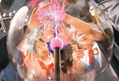學(xué)生們?cè)趶V東科學(xué)中心觀(guān)察和體驗(yàn)“輝光球”放電現(xiàn)象。黃繼明攝(人民圖片)