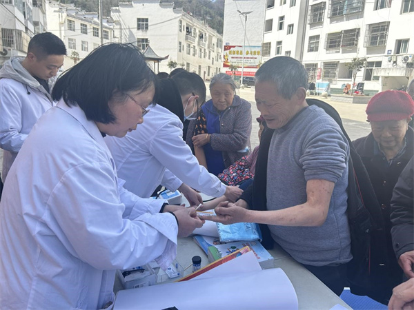 義診現(xiàn)場,醫(yī)生為居民提供測量血壓、血糖等診療服務(wù),耐心詢問居民身體狀況,讓他們及時(shí)了解自己的身體狀況及相關(guān)疾病的預(yù)防。同時(shí),還為前來就診的老年人普及糖尿病、高血壓健康保健知識和日常生活的養(yǎng)生常識,引導(dǎo)他們樹立防護(hù)意識,培養(yǎng)健康生活習(xí)慣。